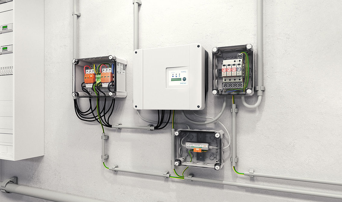 La protección contra sobretensiones para instalaciones fotovoltaicas siempre tiene dos caras: por diversos motivos, las sobretensiones pueden acoplarse al sistema tanto en el lado de CC como en el de CA y dañar, por ejemplo, los inversores. La protección contra sobretensiones de OBO protege de forma segura ambos sistemas. Para proteger la entrada de CC del inversor, OBO ofrece una gama de cajas de conexiones para generadores con protección contra rayos y sobretensiones. Estas han demostrado ser una solución especialmente fiable para proteger las instalaciones fotovoltaicas, y combinan la experiencia de OBO en dos unidades de producto: cajas de conexiones resistentes a la intemperie del ámbito de la tecnología de conexión y fijación con soluciones fiables del ámbito de la protección contra sobretensiones.