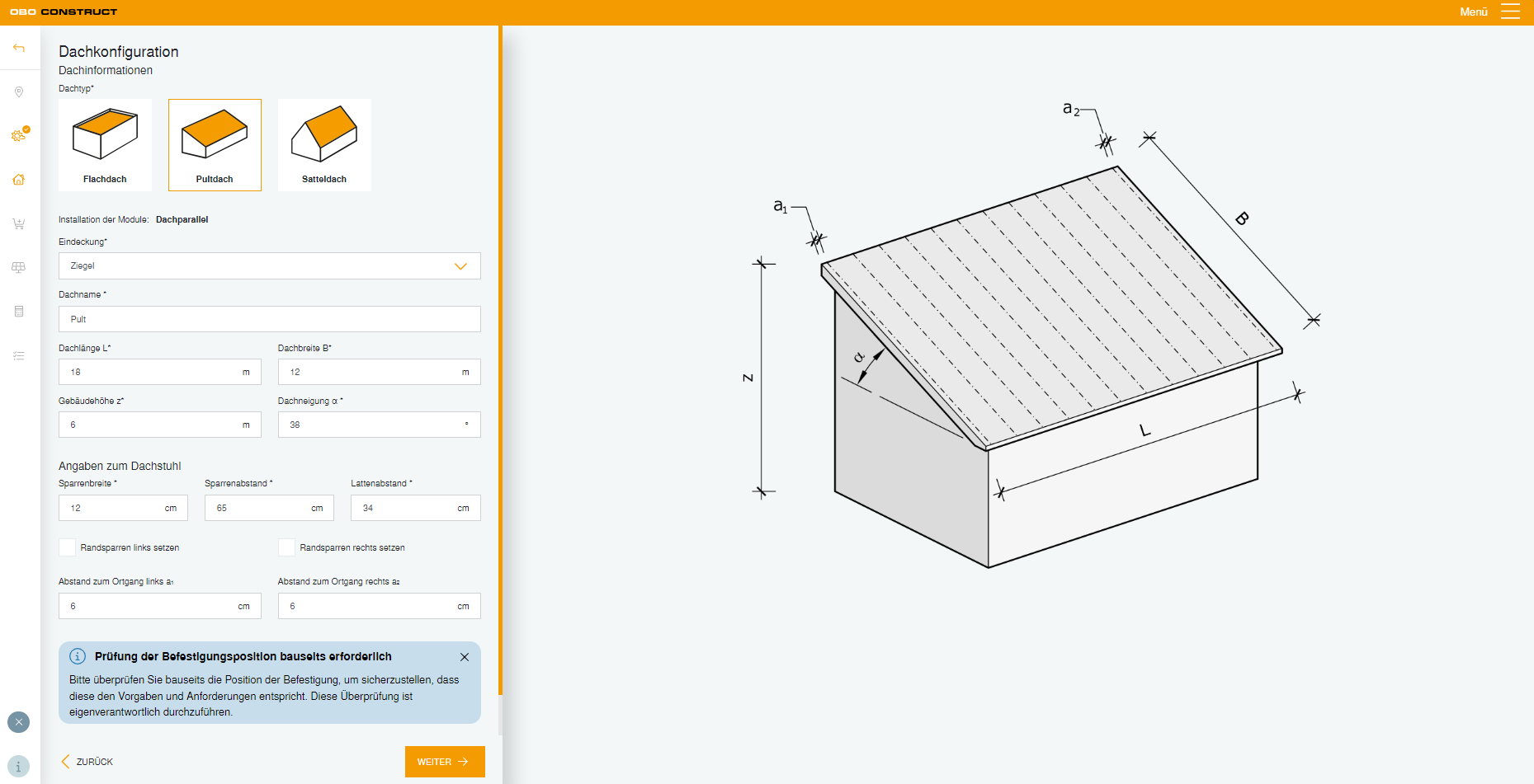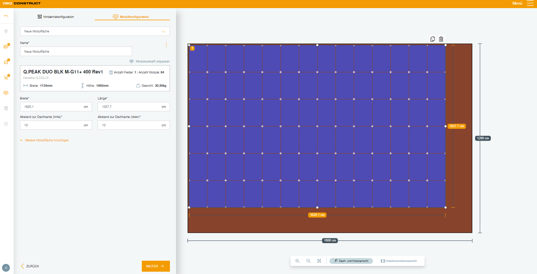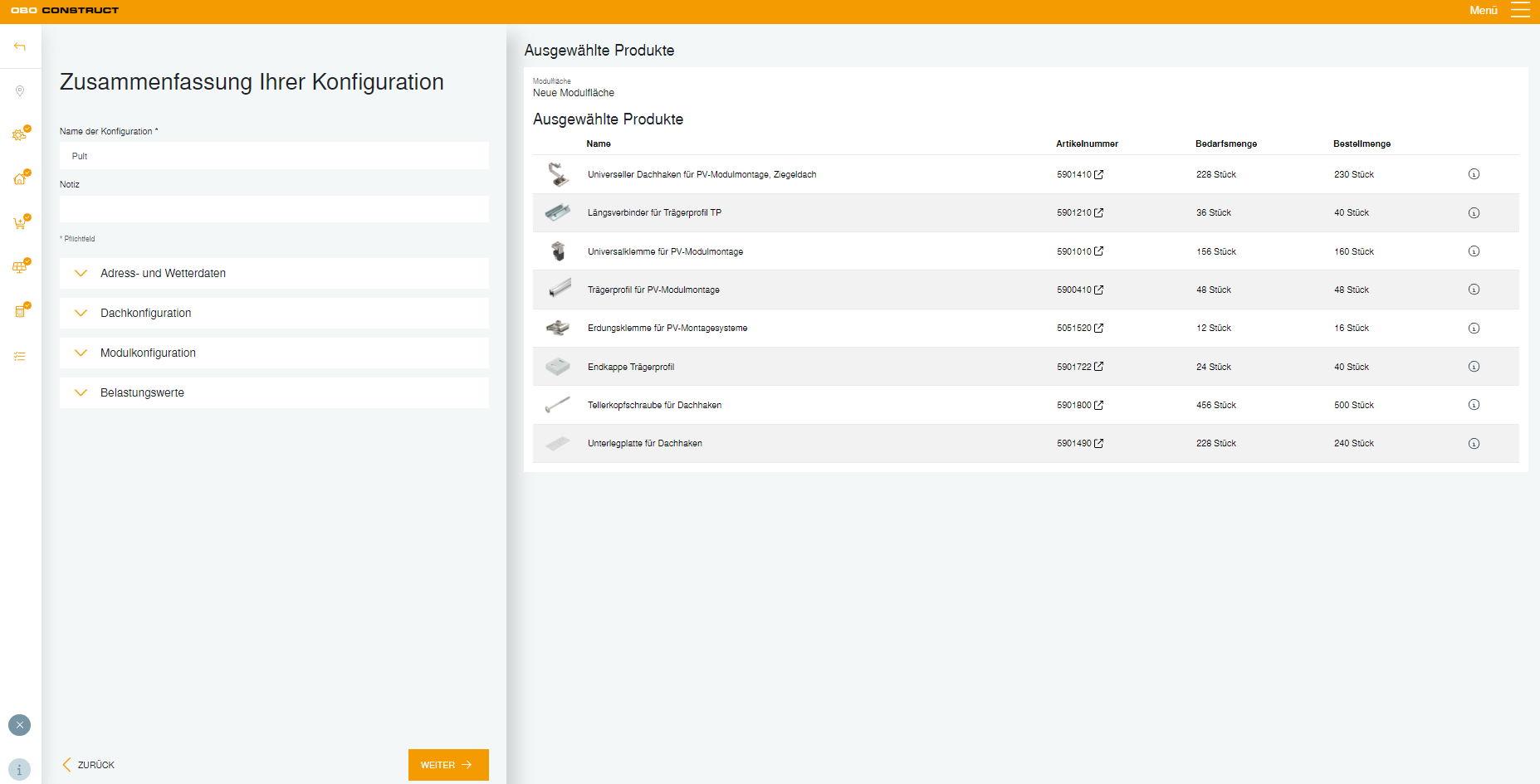 Descubra el futuro de la planificación fotovoltaicaPlanificar sistemas de montaje fotovoltaicos nunca ha sido tan fácil: la OBO Construct Tool para la Magic PV Solution lo hace posible. La herramienta de planificación destaca por su manejo intuitivo y claro, y sus rápidos procesos de planificación. La aplicación le guiará paso a paso hasta encontrar el sistema de montaje fotovoltaico de OBO adecuado teniendo en cuenta sus ideas y sus requisitos.