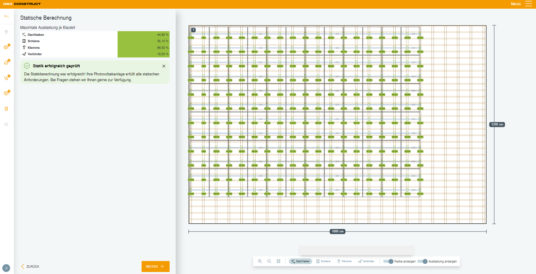 Cree su proyecto fotovoltaico en línea, trabaje en él y guarde su planificación. Nuestra herramienta calcula automáticamente la cantidad de componentes necesarios y, a partir de ella, genera un gráfico de subestructuras y módulos basado en la planificación. Este también puede descargarse fácilmente en forma de textos de licitación y distintos documentos para el cálculo estático de nuestra estructura de montaje en distintos formatos de archivo.