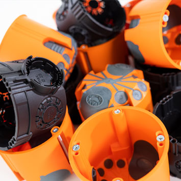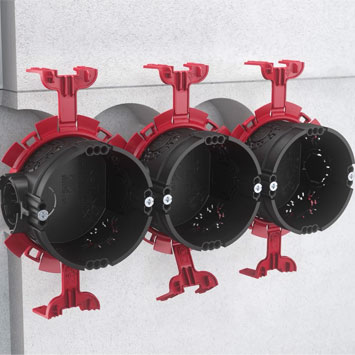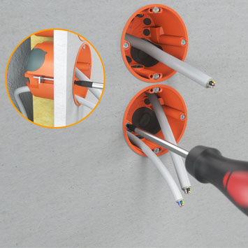 Las cajas empotrables y para paredes huecas también destacan en términos de sostenibilidad: toda la gama está 100 % libre de halógenos, lo que garantiza una seguridad adicional en caso de incendio, ya que reduce la formación de gases de humo tóxicos. La protección acústica de las variantes herméticas de las cajas para paredes huecas está probada y certificada y consiguen una insonorización de 70 dB sin debilitar el panel de yeso estándar.
