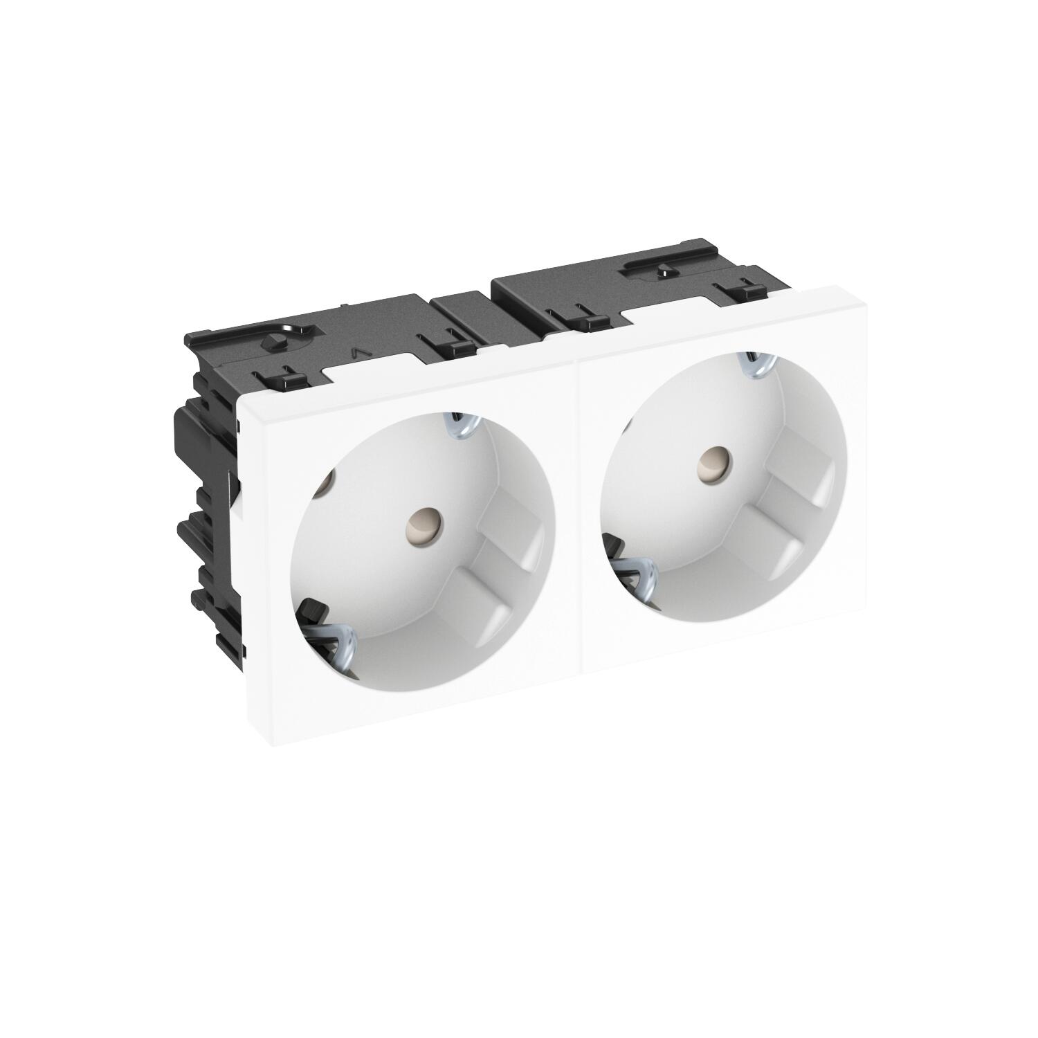 Descripción de productoToma eléctrica doble, 33°, con puesta a tierra y con protección para niños, 2 polos,16 A, 250 V~, con bornes de unión según IEC 60884-1.