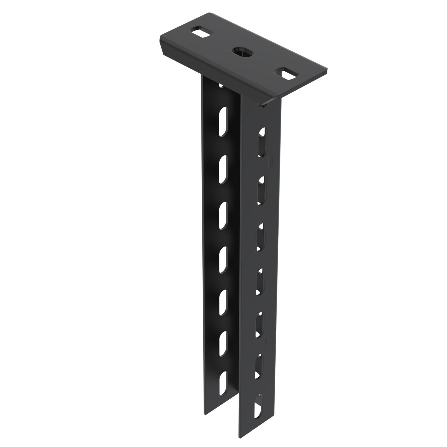 Descripción de productoSuspended support made from U profile with welded-on head plate, perforated to 3 sides, for the creation of support constructions for cable trays. Suitable for mounting on horizontal concrete ceilings and steel supports. Wall and support bracket can be mounted on both sides of the U suspended support. Spacer DSK to insert, from bracket width 400 mm or when mounting the bracket on the end of the suspended support. With black powder coating.